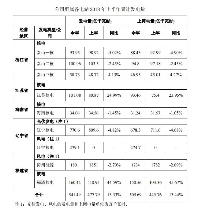 江蘇核電、福清核電上半年累計發電量較去年同比增加較多,主要原因為田灣3號機組于2018年2月投產、福清4號機組于2017年9月投產,發電量增加較多。