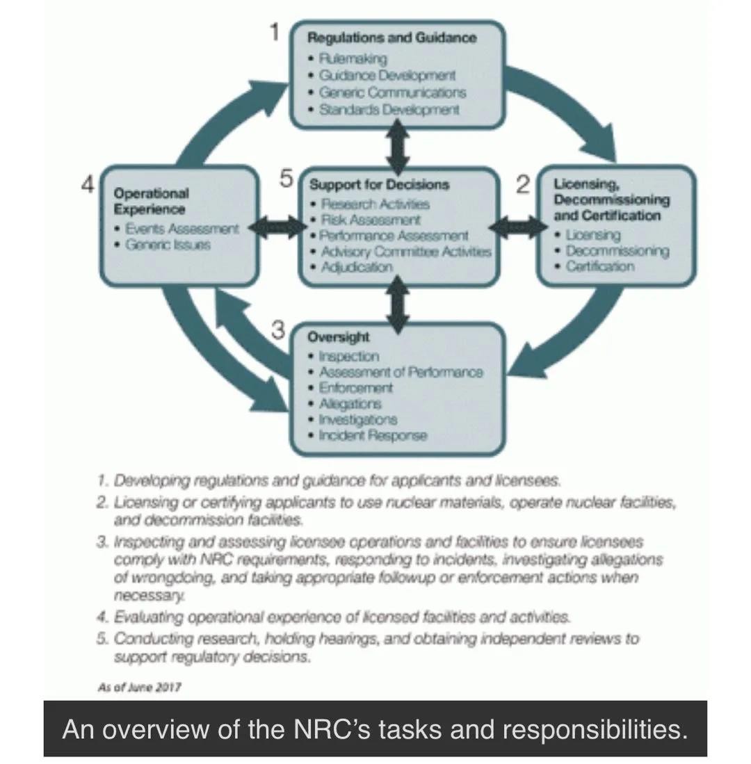 這些信息隨后被納入監(jiān)管的相關(guān)技術(shù)文件(例如各類NUREG),這些文件隨后被用于核反應(yīng)堆許可證的頒發(fā)和延期。NRC網(wǎng)站上設(shè)有一個大的圖書館,其中包括這些技術(shù)文件(NUREG)。所有這些都有助于使整個核能監(jiān)管程序盡可能的對公眾透明,同時也提供了涉及到的技術(shù)、材料和工藝流程的寶貴信息。