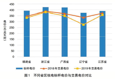 2018年,福建、浙江、廣西、遼寧、江蘇五省的核電機(jī)組參與了市場(chǎng)交易,五省的平均交易電價(jià)分別為345.8元/兆瓦時(shí)、389.0元/兆瓦時(shí)、368.6元/兆瓦時(shí)、335.6元/兆瓦時(shí)和372.9元/兆瓦時(shí)。2019年1季度,福建、廣西、江蘇、遼寧和浙江平均交易電價(jià)分別為332.9元/兆瓦時(shí)、349.9元/兆瓦時(shí)、358.3元/兆瓦時(shí)、274.3元/兆瓦時(shí)和382.1元/兆瓦時(shí)。交易電價(jià)持續(xù)下降,遼寧交易電價(jià)比標(biāo)桿電價(jià)下降100元/兆瓦時(shí)以上。具體交易情況如表1和圖1所示,各省平均交易電價(jià)均較標(biāo)桿電價(jià)有不同程度的下降,且交易電價(jià)呈持續(xù)下降趨勢(shì)。