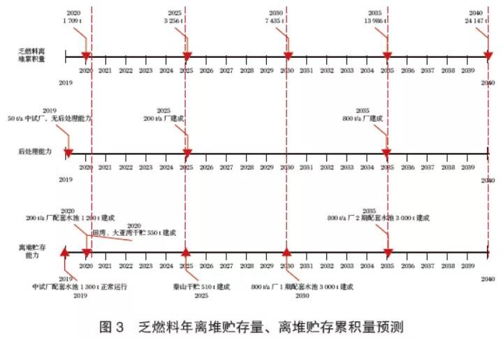 假設在運的后處理中試廠及配套水池正常運行,在建的田灣、大亞灣、秦山核電站的干法貯存設施,后處理示范廠、800t/a后處理廠的配套水池均按計劃建成投運,后處理示范廠、800t/a后處理廠均比規劃的時間節點推遲5年建成投運,結合乏燃料在堆冷卻滿10年后離堆貯存測算條件下的乏燃料離堆貯存累積量,對乏燃料離堆貯存實際需求進行預測。