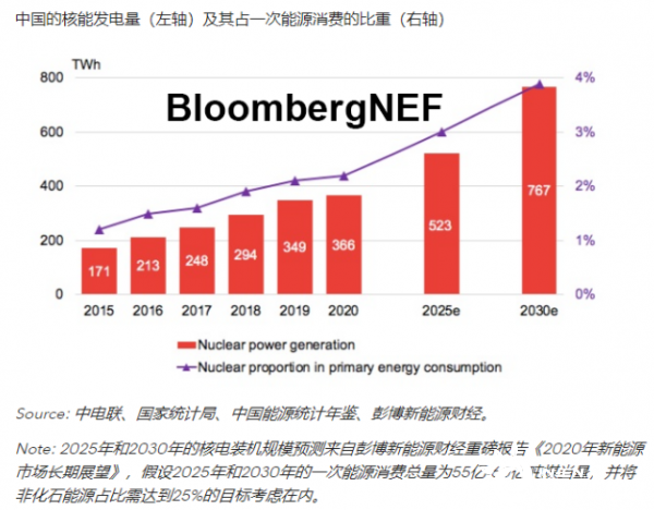中國已承諾在2030年前碳達峰;可再生能源(風電、光伏)總裝機容量達到12億千瓦;非化石能源占一次能源消費比重達到25%。另兩種非化石能源是水電和核電。因主要河流梯級選址有限和生態顧慮,水電規模擴張已經放緩,因此核電將是達到25%目標的關鍵之一。到2030年,核電發電量預計將占一次能源需求的4%,總裝機容量接近1億千瓦。
