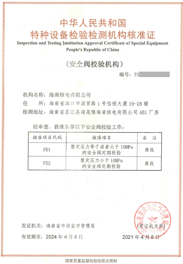 2021年4月12日,海南核電正式獲得由海南省市場監(jiān)督管理局頒發(fā)的《中華人民共和國特種設(shè)備檢驗檢測機構(gòu)核準(zhǔn)證》,核準(zhǔn)項目為高、低壓安全閥定期校驗(FD1、FD2),成為中國核電各成員單位中第一家取得安全閥特種設(shè)備檢驗檢測機構(gòu)資質(zhì)的企業(yè)。