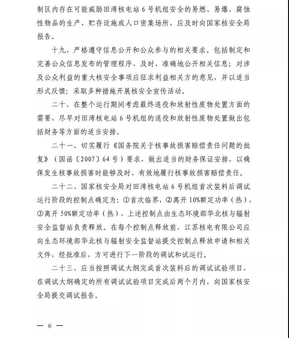 根據(jù)《中華人民共和國核安全法》《中華人民共和國民用核設(shè)施安全監(jiān)督管理條例》的有關(guān)要求,我局對你公司提交的田灣核電站6號機(jī)組運(yùn)行許可證申請書及相關(guān)文件進(jìn)行了審查,認(rèn)為該申請是可以接受的,決定頒發(fā)田灣核電站6號機(jī)組運(yùn)行許可證。