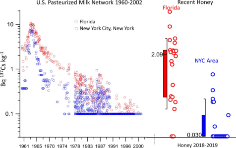 由于蜜蜂在釀造蜂蜜的時候需要將其中大部分的水分蒸發,再結合現有數據,作者推斷,蜂蜜中的137Cs含量或許高于所有其它種類的食物。此外,作者推測,20世紀70年代時,蜂蜜中放射性銫的含量可能比現在高出10倍。
