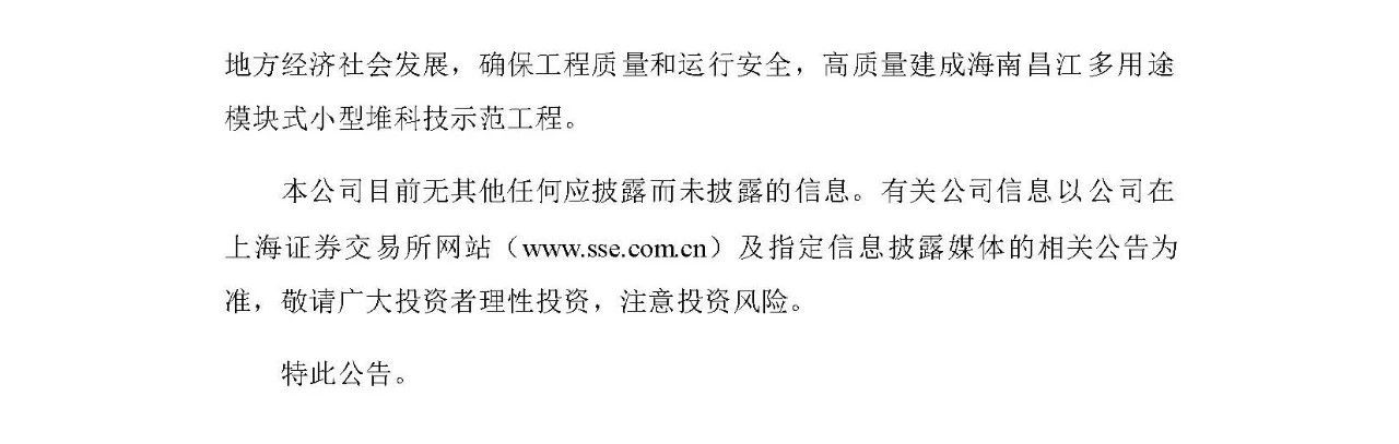 海南昌江多用途模塊式小型堆科技示范工程項目由該公司全資子公司中核海南核電有限公司作為項目業(yè)主,采用該公司控股股東中核集團的“玲龍一 號”小型堆核電機組技術(shù),單臺機組容量為125MW。