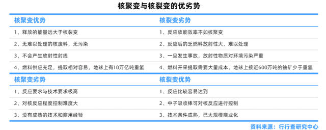 與核裂變原理不同,核聚變是指由質(zhì)量小的原子(主要是氘)在一定條件下(如超高溫和高壓),只有在極高的溫度和壓力下才能讓核外電子擺脫原子核的束縛,讓兩個原子核能夠互相吸引而碰撞到一起,發(fā)生原子核互相聚合作用。相較于核聚變,核裂變優(yōu)點是原材料比較好獲取(鈾礦、瀝青中提取等),可控核裂變的反應(yīng)條件比較能達到,如不需要太高的初始溫度,中子吸收棒控制反應(yīng)速率較易操作等,其技術(shù)條件較為成熟、已經(jīng)大規(guī)模商業(yè)化。