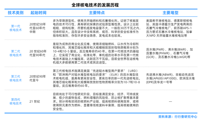 從核電站技術(shù)演變來看,主要可劃分四代核電技術(shù)。其中,第一代是實驗性的核電站,目前已經(jīng)基本全部退役;第二代是以壓水堆/沸水堆為主標(biāo)準(zhǔn)化、系列化和批量化建設(shè)的商業(yè)堆,是目前在運機組的主力;第三代是安全性更高的核電站,是目前在建機組的主力,處于加速推廣期;第四代目前仍處于在研發(fā)階段。