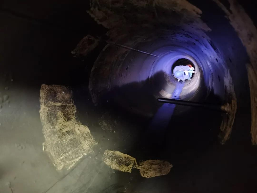 ▲防腐工程師“躺”在海水管道中進(jìn)行作業(yè)