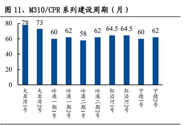 核電站的設(shè)計工期通常為 5 年,而實際建設(shè)周期約在 5-10 年。因缺乏施工經(jīng)驗, 設(shè)計變更,耗時檢測等原因,中國核電機組普遍存在首堆拖期問題,導致建設(shè)期 利息費用增長、發(fā)電成本提高。而批量化生產(chǎn)有利于核電機組建設(shè)周期縮短、成 本下降。實現(xiàn)批量化建設(shè)之后,M310/CPR 等同機型系列建設(shè)周期可逐漸穩(wěn)定在 5 年左右。
