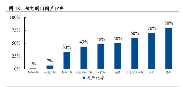 國產(chǎn)研發(fā)替代有利于降低核電建造成本。我國核電機組國產(chǎn)化程度逐步提高,以 核級閥門研發(fā)為例,核電閥門作為機組建設(shè)中使用數(shù)量較多的介質(zhì)輸送控制設(shè)備, 目前已達到近 80%的國產(chǎn)化程度,而國產(chǎn)核級閥門價格僅為進口閥門的 11.5%。