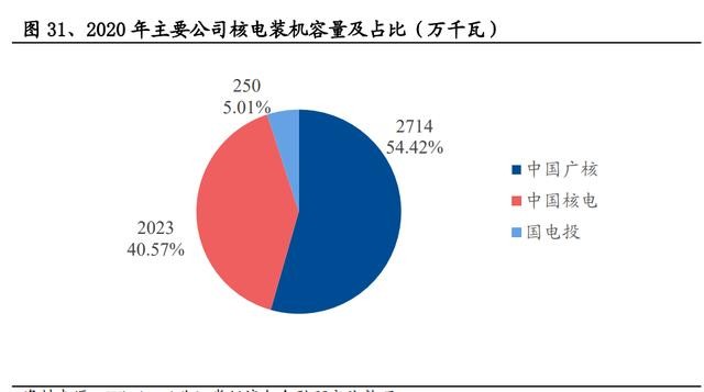 核電的開發(fā)運營具有行政準入壁壘、技術(shù)壁壘、資金壁壘,呈現(xiàn)高度集中的行業(yè) 特征。目前國內(nèi)僅中核、中廣核、國電投、華能 4 家擁有核電運營牌照。截至 2020 年末,中廣核集團的裝機容量占比 54.42%,中國核電集團的裝機容量占比 40.56%, 此外國電投裝機容量占比 5.01%(按控股口徑)。