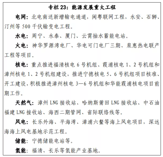 《規劃》提出,著力構建煤、油、氣、核、新能源和可再生能源多輪驅動、協調發展的能源供應體系。重點推進漳州核電、霞浦核電、神華羅源灣電廠等大型電源項目建設,建成華電可門電廠三期、漳州核電 1、2 號機組、霞浦核電示范快堆1號機組,到 2025 年,力爭全省電力總裝機達 8000 萬千瓦以上。