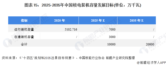 根據《“十四五”規劃和2035遠景目標綱要》,至2025年,我國核電運行裝機容量達到7000萬千瓦。此外,根據中國核能行業協會發布的《中國核能年度發展與展望(2020)》中的預測數據顯示,到2025年,我國在運核電裝機達到7000萬千瓦,在建3000萬千瓦;到2035年,在運和在建核電裝機容量合計將達到2億千瓦;核電建設有望按照每年6至8臺機組穩步推進。
