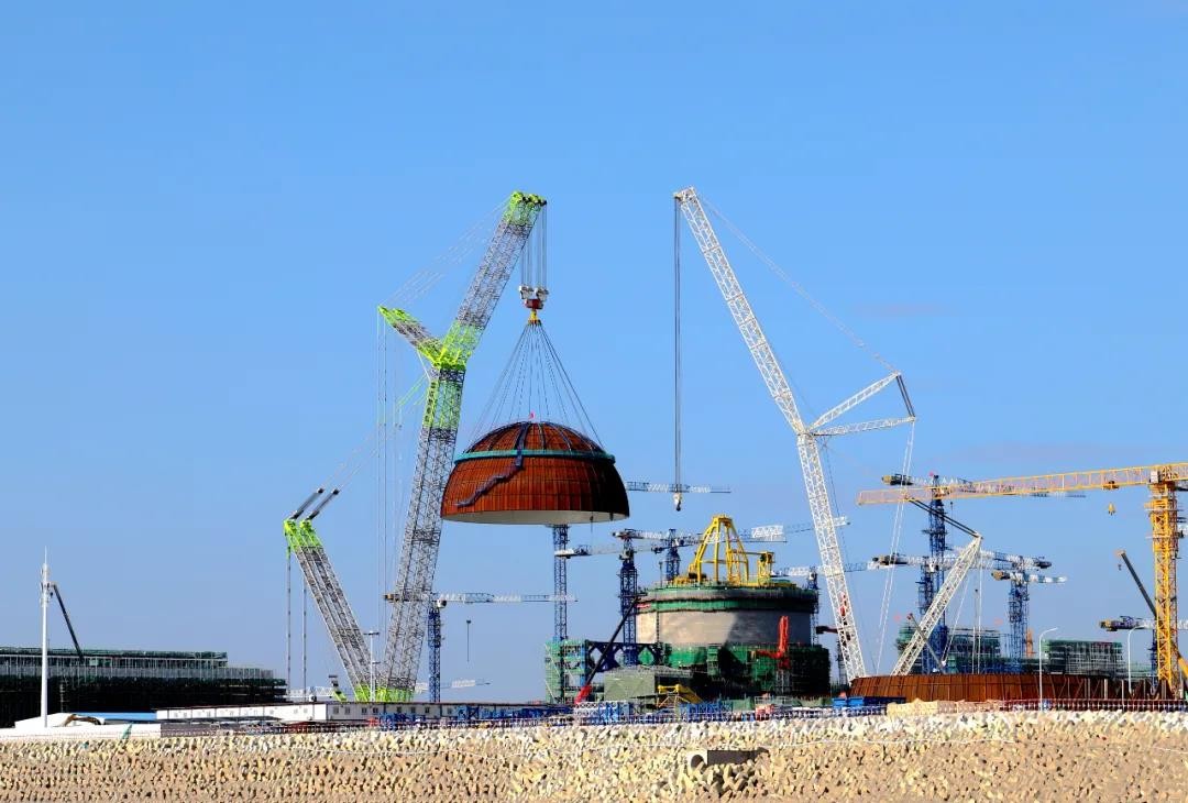 10月27日上午,我國自主三代核電華龍一號批量化建設首臺機組——中核集團漳州核電1號機組內穹頂成功吊裝,標志著該機組從土建施工階段全面轉入設備安裝階段,華龍一號批量化建設邁出堅實步伐。