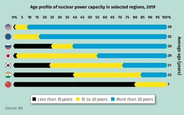 在選定的地區,核電裝機容量的堆齡概況