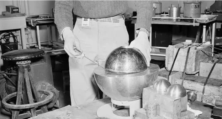 钚球被能反射中子的碳化鎢鎢裹,這是哈里·達(dá)利安在1945年進(jìn)行的實(shí)驗(yàn)的場景重現(xiàn)