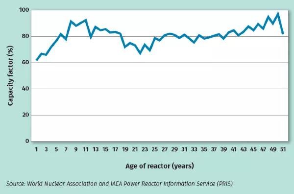 因此,2020年出現(xiàn)的更高容量因數(shù),不僅是通過較新反應堆的良好性能實現(xiàn)的,而且是通過較舊反應堆的性能改進實現(xiàn)的。 反應堆的使用年限似乎不是實現(xiàn)高容量因數(shù)的障礙。