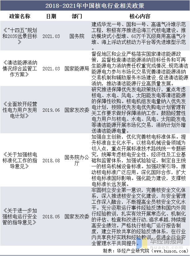 2018-2021年,中國陸續出臺了多個核電行業政策,保障核電運營的規范性和安全性。核電行業政策和國家對于低碳排放及推廣清潔能源的要求成為了核電行業持續發展的重要推力。