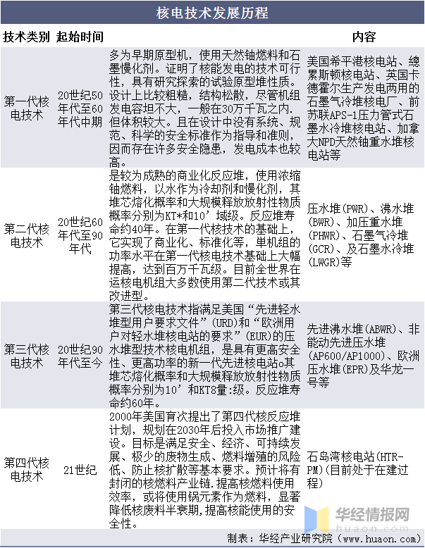 由于核電技術相當復雜,且不斷更新迭代的核電站技術對國家及企業技術研發水平的要求較高。目前,我國核電的整體技術水平處于第二代改進型向第三代核電技術過渡階段。2018年6月,運用第三代核電EPR技術路線的臺山核電站及AP1000技術路線的三門核電站實現首次并網發電。國內核電企業及研究機構在推廣我國自主研發的第三代核電技術實現大規模、商業化應用的基礎上,也在持續推進快堆及先進模塊化小型堆的示范工程建設,并在超高溫氣冷堆、熔鹽堆等新一代先進堆型關鍵技術設備材料研發方面大力投入。