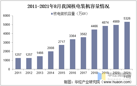 根據國家能源局,2020年國內新投入商運核電機組1臺,為田灣核電5號機組。截止到2020年底,全國商運核電機組為48臺,總裝機容量達4989萬千瓦。2011-2020年,除了2012年外,其余年份全國商運核電機組裝機規模均保持增長。截至2021年8月底我國大陸在運核電機組有51臺,裝機容量為5326萬千瓦;
