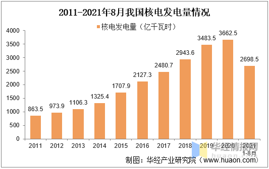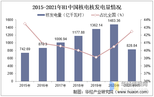 2021年1-6月,全國累計發電量為38717.0億千瓦時,運行核電機組累計發電量為1950.91億千瓦時,占全國累計發電量的5.04%,比2020年同期上升了13.76%;累計上網電量為1830.51億千瓦時,比2020年同期上升了14.12%。