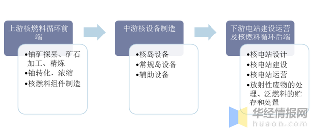核電產業鏈的上游為鈾礦開采加工精煉、鈾轉化濃縮和核燃料組件制造;中游為核電設備制造環節,主要包括核島設備、常規島設備和輔助設備;下游是核電站建設運營及乏燃料處理等。