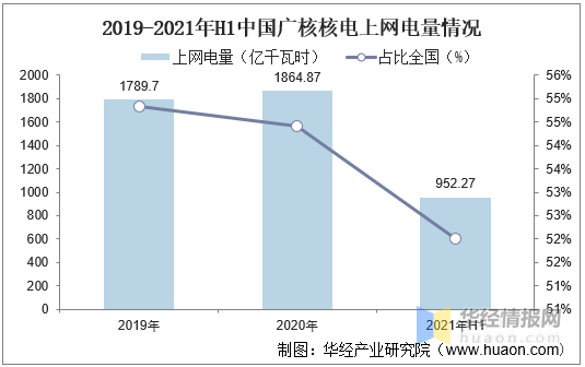 2020年,中國廣核管理的核電站的總上網電量為1864.87億千瓦時,占全國核電機組上網電量的54.41%。截至2021年上半年,中國廣核管理的核電站的總上網電量為952.27億千瓦時,占全國核電機組上網電量的52.02%,較2020年同期增長5.40%;
