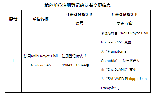 根據(jù)《民用核安全設備監(jiān)督管理條例》及其配套規(guī)章的要求,我局對相關單位民用核安全設備許可證信息變更的申請進行了審查。經研究,同意東方電氣股份有限公司、中國能源建設集團浙江火電建設有限公司、中廣核檢測技術有限公司、西安核設備有限公司、中核嘉華設備制造股份公司、滬東重機有限公司等6家單位民用核安全設備許可證信息變更(見附件1)和法國Rolls-Royce Civil Nuclear SAS境外單位注冊登記確認書信息變更(見附件2)。