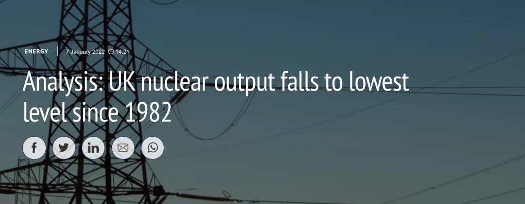 據CarbonBrief網站的分析顯示,英國的核電產量已降至1982年以來的最低水平。由于英國反應堆的退役和停運,2021年英國核電下降9%,導致去年低碳電力減少17萬億瓦小時(TWH),風力發電也下降了15%。
