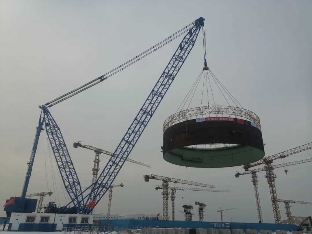 春節(jié)假期剛結(jié)束,徐大堡核電廠就迎來(lái)了重大施工活動(dòng)——將半徑22米、總重約102噸的核島安全殼鋼襯里筒體模塊利用重型吊車從島外拼裝現(xiàn)場(chǎng)一次性吊裝到核島混凝土基礎(chǔ)上。監(jiān)督員結(jié)合吊裝施工計(jì)劃和吊裝專項(xiàng)方案,有針對(duì)性地開展了吊裝前的各項(xiàng)準(zhǔn)備情況檢查,包括鋼襯里模塊拼裝完成情況、吊裝方案準(zhǔn)備情況、環(huán)形吊具組裝試吊情況、安全質(zhì)量措施落實(shí)情況等。認(rèn)真核查了鋼襯里模塊承壓區(qū)域混凝土強(qiáng)度情況,在施工現(xiàn)場(chǎng)見證了混凝土強(qiáng)度測(cè)試試驗(yàn)。鋼襯里模塊于2022年2月18日上午5點(diǎn)58分起吊,歷經(jīng)起吊、提升、變幅、再提升、轉(zhuǎn)臂、下降等步驟,耗時(shí)三個(gè)多小時(shí),最終于上午9點(diǎn)50分順利完成了吊裝就位等工作。