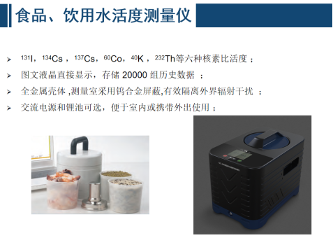 • 實(shí)驗(yàn)室樣品分析測(cè)量設(shè)備 當(dāng)直接測(cè)量法受現(xiàn)場(chǎng)條件制約難于進(jìn)行或其靈敏度難于滿足測(cè)量要求時(shí),通常采用取樣、處理、測(cè)量的實(shí)驗(yàn)室分析方法,應(yīng)特別關(guān)注樣品的代表性和樣品處理方法可能對(duì)測(cè)量結(jié)果產(chǎn)生的影響。介質(zhì)一般包括擦拭樣、空氣、水及水生物、土壤及沉積物、動(dòng)植物及其產(chǎn)品等。監(jiān)測(cè)內(nèi)容包括 α / β / γ 總活度、 α /γ 核素分析、核素活度、沉降率等。常用的監(jiān)測(cè)分析儀器主要包括 α 譜儀、 γ 譜儀、 β計(jì)數(shù)器、液閃計(jì)數(shù)器、電感耦合等離子體質(zhì)譜等。