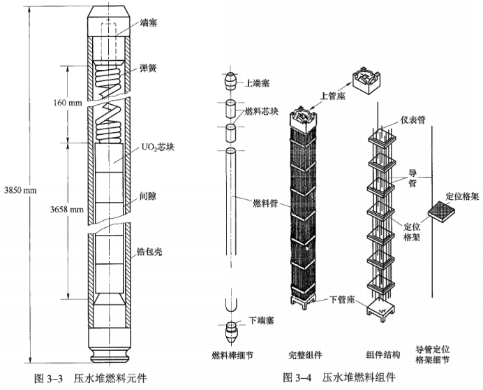 包殼與芯塊之間有 0.17 mm 的間隙, 目的在于補償句殼和燃料芯塊不同材料的熱膨脹和燃料的輻照腫脹,減少句殼超應(yīng)力的風(fēng)險。燃料芯塊的上下兩端設(shè)有氧化鋁隔熱塊,頂部有彈簧壓緊,兩端用鋯合金端塞封堵,并與包殼管焊接密封在一起。彈簧所在空間可容納燃料放出的裂變氣體,氣空間充3MPa壓力的氦氣,用來改善間隙的傳熱性能和減小包殼內(nèi)外的壓差。壓水堆燃料組件外面不加裝方形盒,即所謂開式柵格, 以利于冷卻劑的橫向流動。密封的燃料元件包殼構(gòu)成了包容放射性物質(zhì)的第一道安全屏障。