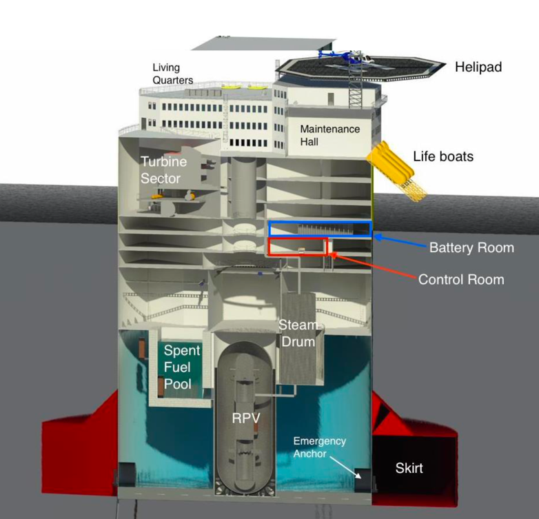 OFNP的外形是一個巨大的圓柱體,圓柱體內布置了很多水密封艙隔間。在圓柱體的中間,布置一座反應堆。