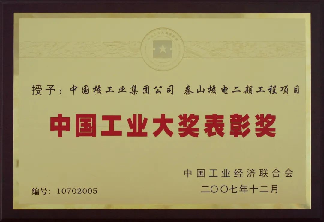 2007年12月26日,秦山核電二期工程項目榮膺中國工業大獎表彰獎。