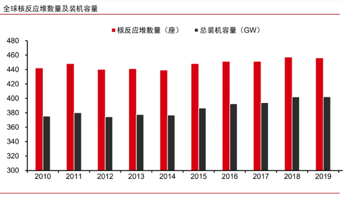 截至 2020 年年底,全球核反應堆共有 448 座,總容量為 397.78GW。
