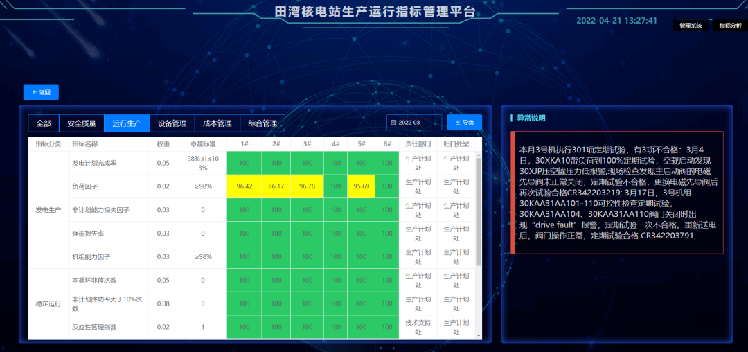 生產(chǎn)計(jì)劃處積極落實(shí)公司頂層設(shè)計(jì),堅(jiān)持系統(tǒng)思維,推動(dòng)標(biāo)桿管理,以“安全發(fā)展、提質(zhì)增效、精準(zhǔn)施策、數(shù)字賦能”為指導(dǎo)思想,分層分類實(shí)施一系列精細(xì)化管理舉措,構(gòu)建以集約高效為核心的精細(xì)計(jì)劃和精益管理方案,率先發(fā)布機(jī)組生產(chǎn)運(yùn)行指標(biāo)體系,組織開發(fā)了生產(chǎn)運(yùn)行指標(biāo)管理智慧平臺(tái),數(shù)字驅(qū)動(dòng),智慧賦能,定目標(biāo)、追過程、拿結(jié)果,奮力打造運(yùn)行機(jī)組標(biāo)桿精品,為田灣基地高質(zhì)量發(fā)展砥礪奮進(jìn)。