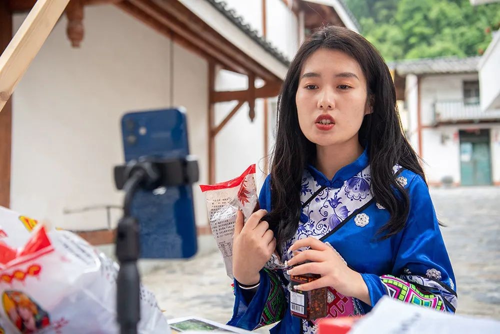 在金鈴鄉民俗風情街主播在現場直播推銷土特產