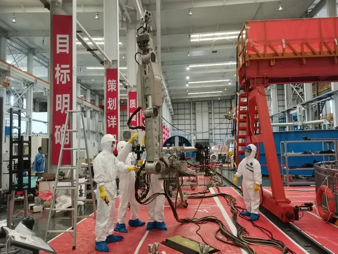 在疫情封控期間,青浦研發實驗基地48名駐崗人員24小時堅守崗位,在嚴格遵守防疫要求的前提下,有序開展了紅沿河核電H501大修反應堆壓力容器在役檢查準備工作。他們以基地為家,模擬真實的核電廠現場吊裝及安裝機械手操作,多次進行培訓演練,高效完成了前期試驗數據采集與分析工作。