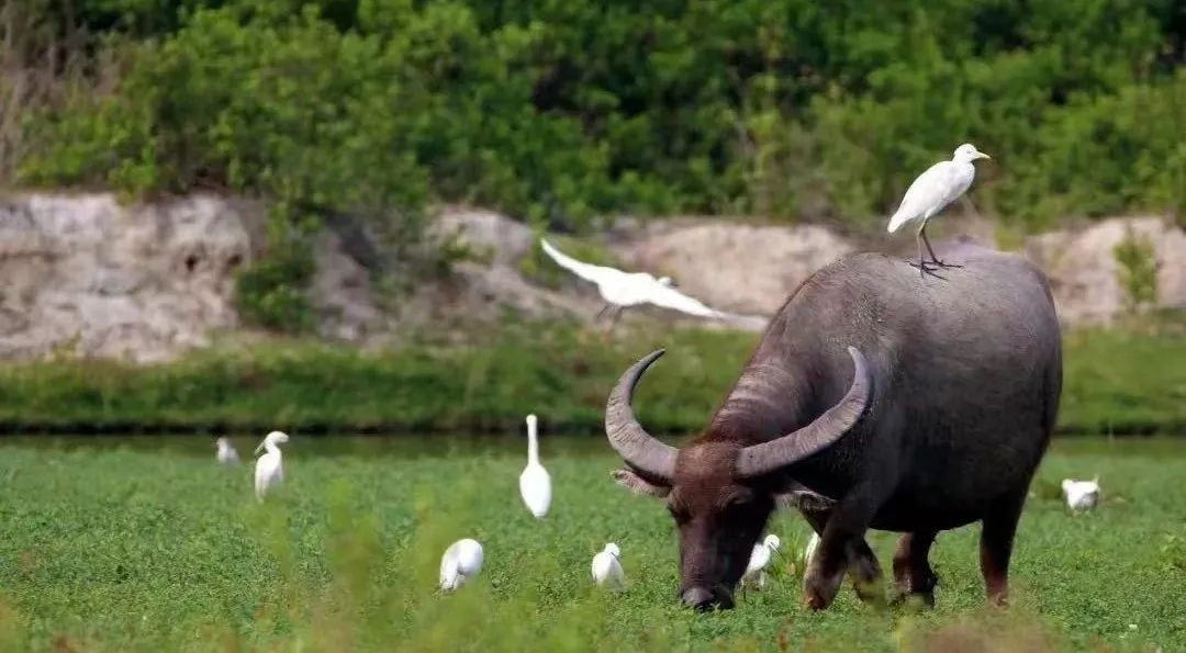 白鷺、水牛在海南核電排洪渠形成的人工濕地上嬉戲