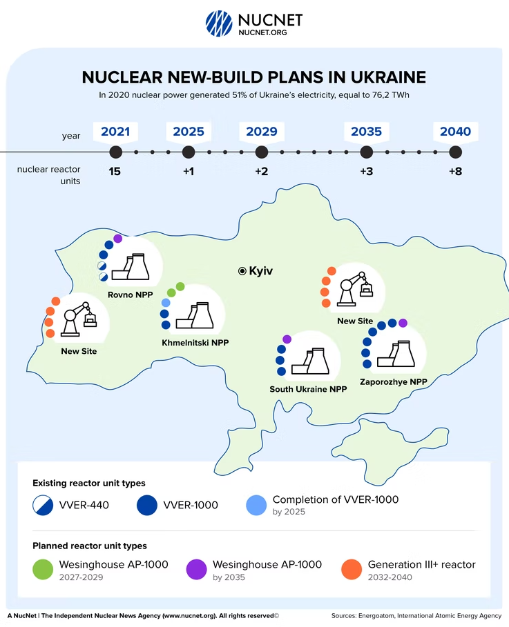 2021 年 11 月,西屋公司和 Energoatom 簽署了一項(xiàng)協(xié)議,承諾在烏克蘭建造五個(gè)新的 AP1000 反應(yīng)堆單元——兩個(gè)在烏克蘭西南部的赫梅利尼茨基工廠,另外三個(gè)將在 2035 年前分布在該國的其他現(xiàn)有工廠。