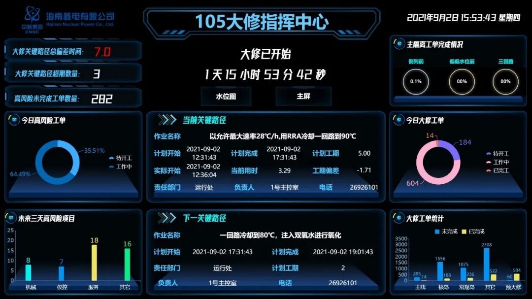 海南核電將“持續(xù)全面推進(jìn)大修優(yōu)化管理”作為年度大修領(lǐng)域精細(xì)化管理的重點(diǎn)任務(wù),不斷創(chuàng)新性開(kāi)發(fā)完善大修信息展示、大修信息跟蹤、大修信息決策等數(shù)智平臺(tái),將大修進(jìn)展與每個(gè)階段信息完美展現(xiàn),為大修工作提供了可視化跟蹤,為大修負(fù)接口管理提供了強(qiáng)大的信息化手段。海南核電大修信息化展示平臺(tái)也是全國(guó)核電首例關(guān)鍵路徑實(shí)時(shí)跟蹤的典范,并作為中國(guó)核電良好實(shí)踐在同行電廠(chǎng)進(jìn)行推廣。