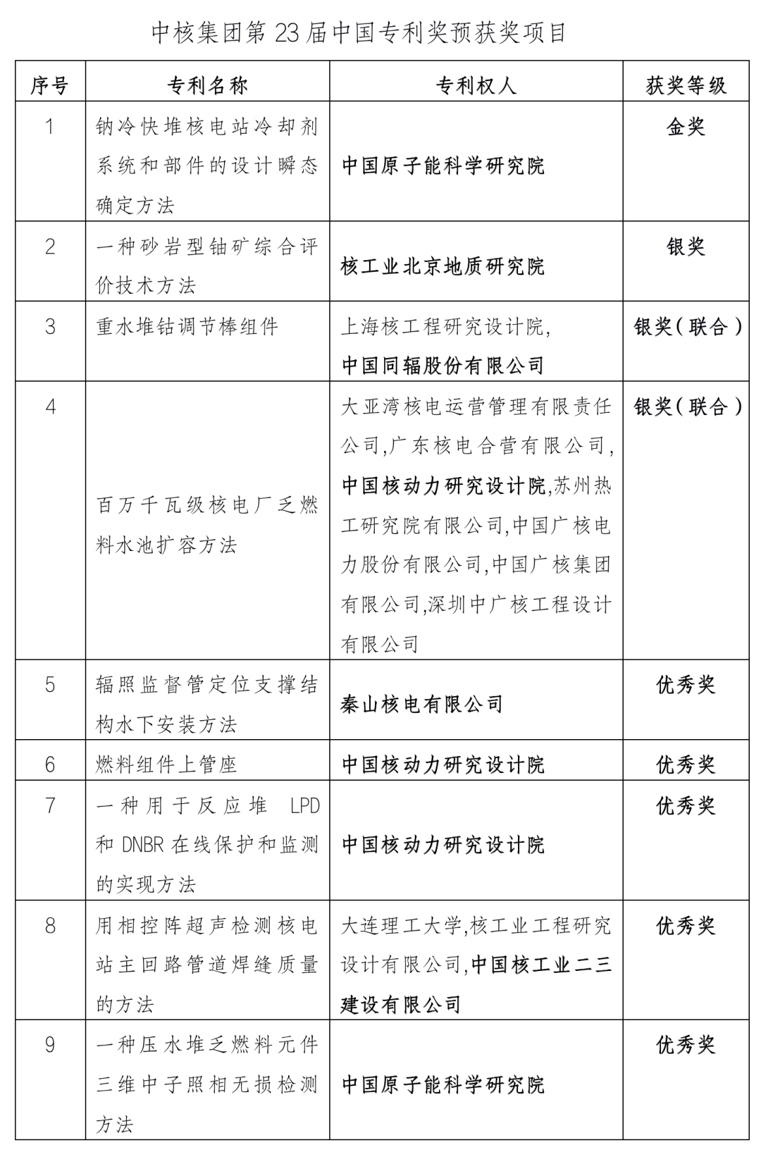 7月26日,國家知識產權局公布了關于第23屆中國專利獎授獎的決定,中核集團共9件專利獲獎,繼2021年獲得中國專利金獎后再次獲得1項金獎、3項銀獎以及5項優秀獎,突破歷史最好成績。