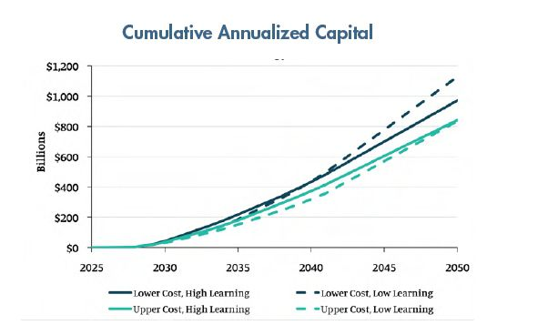 到2050年先進(jìn)核能將成為美國(guó)電力結(jié)構(gòu)的重要組成部分,因此先進(jìn)核能的成本將在很大程度上影響全國(guó)零售電價(jià)。早期的資本投資和積累的建設(shè)經(jīng)驗(yàn)?zāi)軌蚴瓜冗M(jìn)反應(yīng)堆項(xiàng)目造價(jià)和先進(jìn)核電技術(shù)的平準(zhǔn)化度電成本大幅降低,從而促進(jìn)新反應(yīng)堆在全國(guó)范圍內(nèi)大規(guī)模部署。