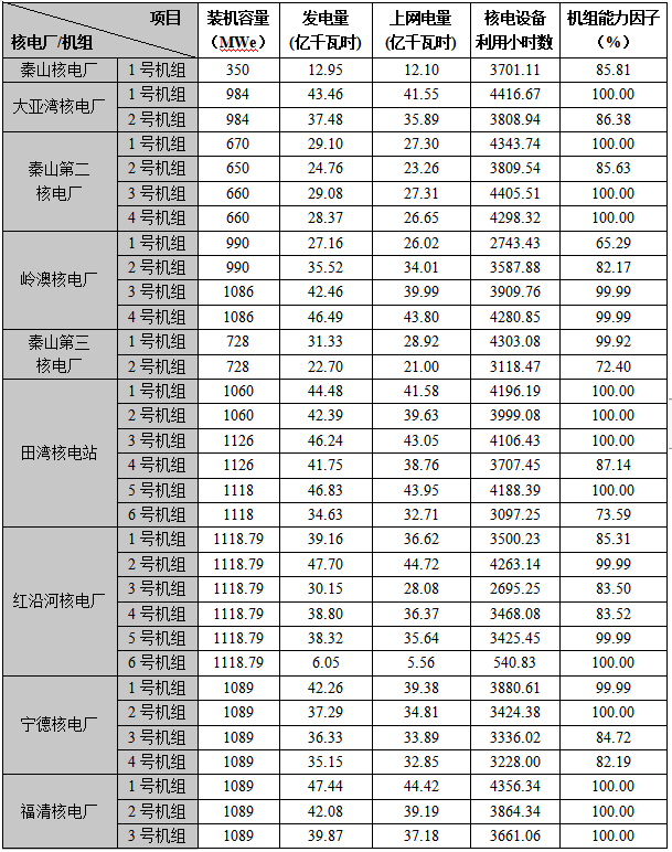 3) 本表“合計值/整體值/平均值”中,裝機容量、發電量、上網電量為各機組合計值,核電設備利用小時數為全部機組整體值,機組能力因子為全部機組的算數平均值。