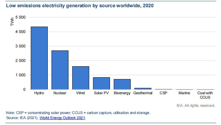 2020年,核能發電量約占全球發電量的10%,超過了風能和太陽能發電總量,是僅次于水電的第二大清潔電力來源。截至2021年底,全球有32個國家的439座反應堆在運,總裝機容量為4.13億千瓦,其中2.7億千瓦在發達經濟體。核能為減緩全球碳排放量上升速度做出了重要貢獻,自20世紀70年代以來,已使全球碳排放量減少約66億噸。