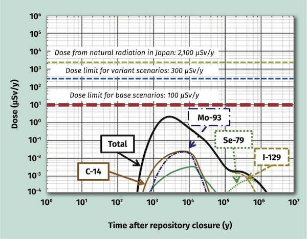 這種方法達到了低得離譜的安全目標,比自然背景水平低幾個數(shù)量級,評估時間跨度極長,長達數(shù)千年甚至數(shù)百萬年。如下圖。