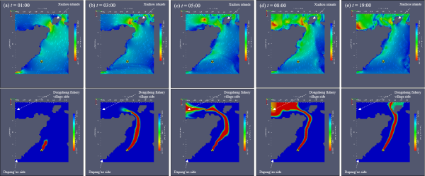 核泄漏事故后不同時刻近岸流場(上)及核素濃度(下)分布的動態仿真模擬