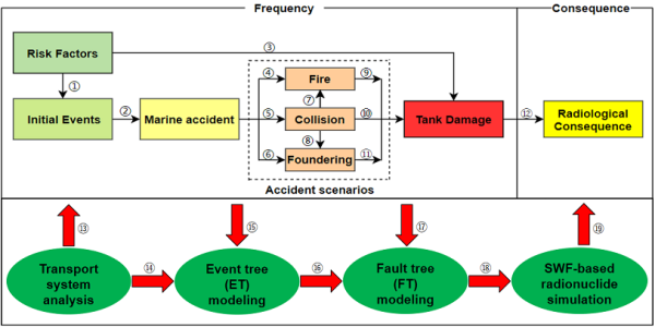 針對乏燃料海上運輸風險評估研究中缺乏對人員失誤、船舶故障、航行環境等內外部風險因素綜合表征及量化分析的問題,該研究提出一種耦合確定論和概率論的乏燃料海上運輸一體化概率風險評估IPRA方法,并構建綜合風險指標體系,建立核素擴散水動力模型,實現近岸海水中核素濃度的動態精細模擬及公眾放射性風險量化 。