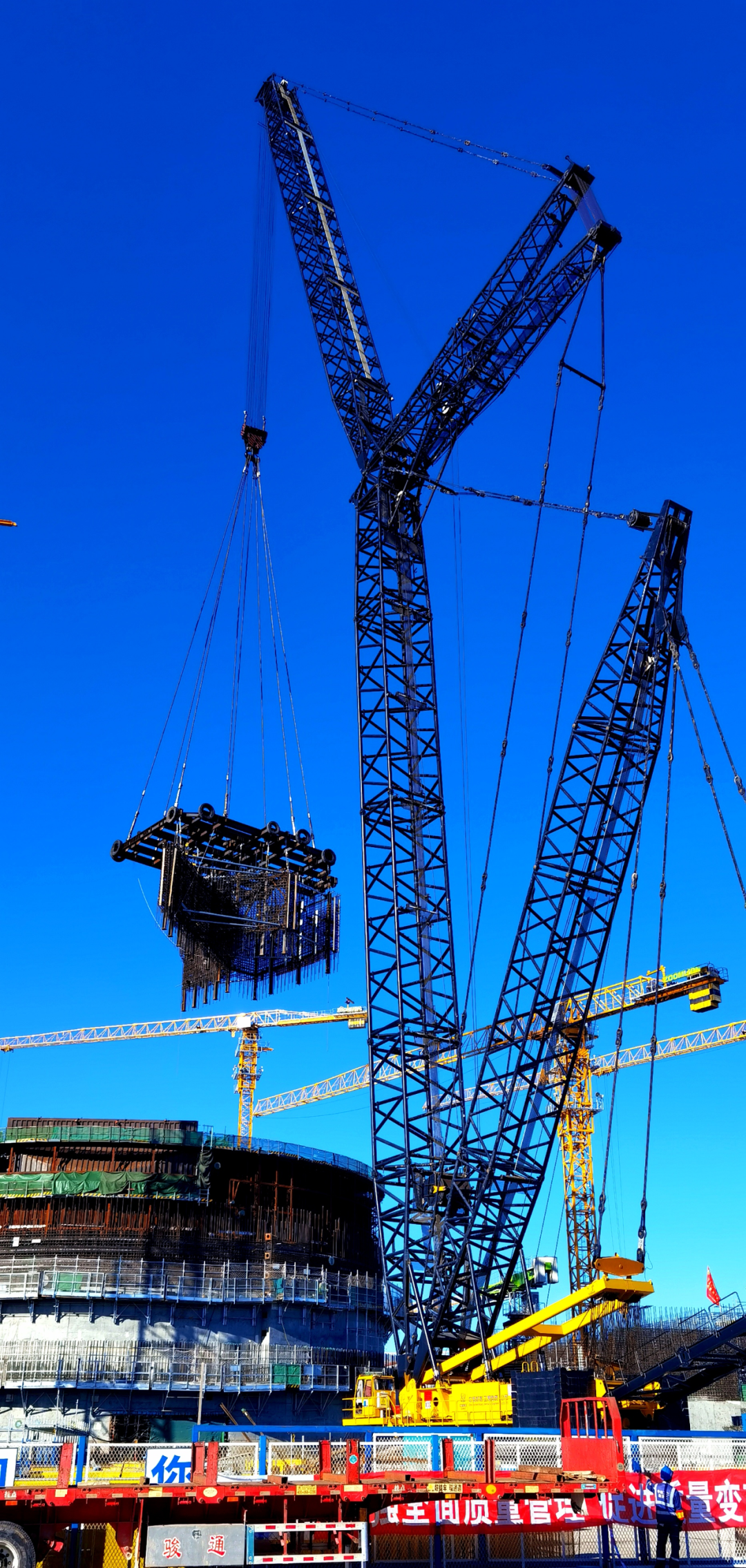 徐大堡核電3號機組反應堆廠房內部結構墻體鋼筋-預埋件組合模塊,是將內部結構第四層墻體設計為3個帶預埋件的鋼筋模塊,為多段、異形墻體組合模塊。在組合模塊中最大長邊幾何尺寸14米,累計總長度34.18米,吊裝總重量118噸。此次吊裝的異形墻體組合鋼筋模塊,是在不改變設計的情況下,通過技術創新、工藝創新、工裝創新,將其設計為鋼筋籠-預埋件組合模塊,實現反應堆廠房內部結構真正意義上的鋼筋模塊化施工,為反應堆內部結構車間化預制、模塊化施工開拓出一種新的建造方式。