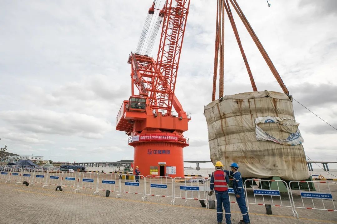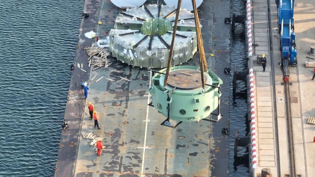 ▲8號(hào)機(jī)組堆芯捕集器殼體完成卸船